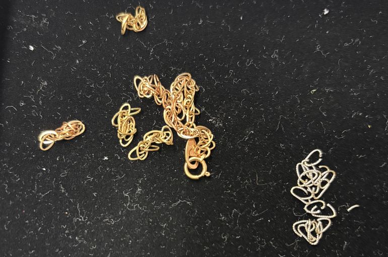 写真のように、チェーンが細かく絡まっていたり、一部が切れて使えなくなってしまっている状態でしたが、金やプラチナなどの貴金属は壊れていても価値があります。